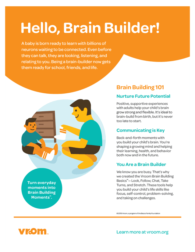 An update of the Brain Story flyer, the Brain Building 101 flyer shares the same important scientific research behind Vroom in a new and more accessable way. Available here in a bilingual format: one side is English and the other side is Spanish.